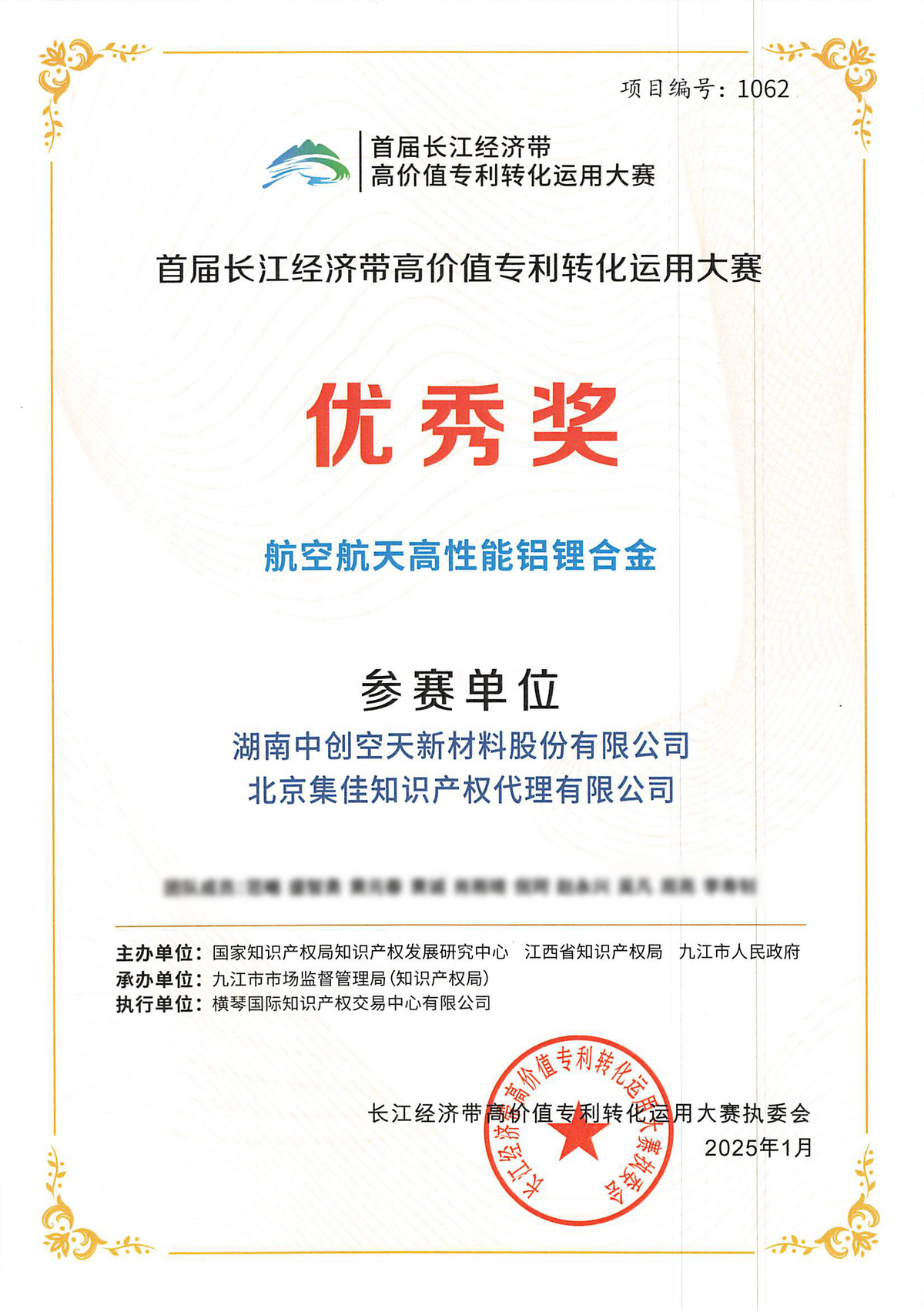 近日,在備受矚目的長江經濟帶高價值專利轉化運用大賽全國決賽中,由北京集佳知識產權代理有限公司與湖南中創空天新材料股份有限公司聯合參賽的“航空航天高性能鋁鋰合金”項目脫穎而出,榮獲優秀獎。這一殊榮不僅是對項目團隊卓越創新能力和不懈努力的高度認可,也是雙方深度合作、共同推動科技成果高效轉化的生動見證。