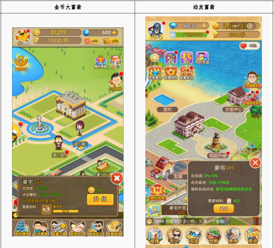 麟貝公司、動友公司、摩多公司共同研發、運營的《動友富翁》游戲,在游戲內容上整體抄襲《金幣大富翁》手游的“建筑系統”“人才精英系統”“投資合作系統”“商戰系統”“金融戰爭系統”“座駕系統”“豪宅系統”“成就系統”“每日任務”等游戲設計,甚至出現《動友富翁》游戲中的bug內容與《金幣大富翁》雷同的情況。